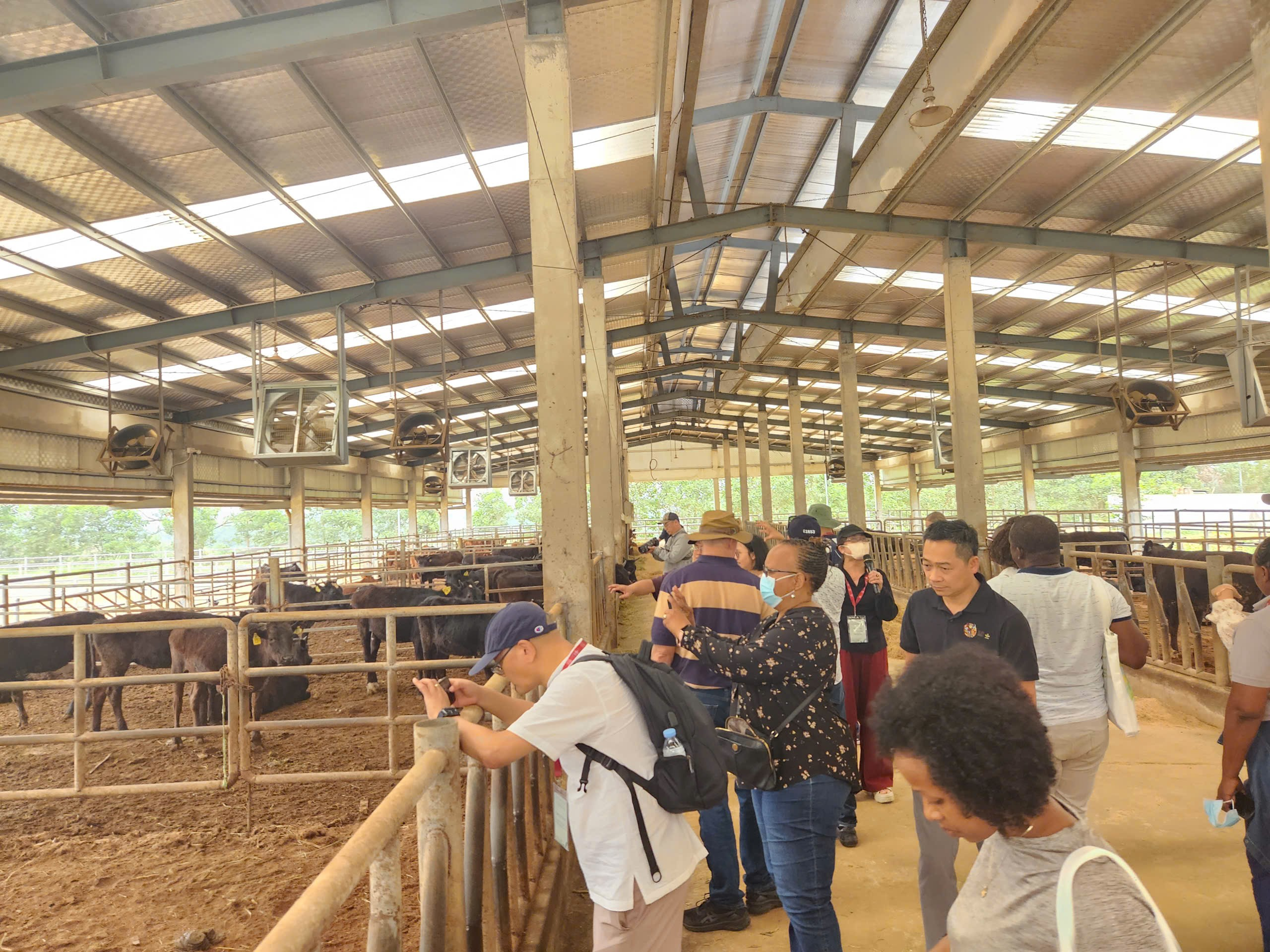 Tại buổi làm việc, đại diện Trung tâm đã giới thiệu tổng quan về Trung tâm, định hướng nghiên cứu cũng như những kết quả nổi bật trong ứng dụng khoa học công nghệ trong chăn nuôi tại Trung tâm. Đặc biệt, Trung tâm đã trình bày các mô hình theo dõi khí thải nhà kính trong chăn nuôi bò thịt, tận dụng phụ phẩm nông nghiệp và nâng cao hiệu quả sử dụng tài nguyên. Trong chương trình tham quan thực địa, đoàn đại biểu đã trực tiếp khảo sát hệ thống chuồng trại, khu chế biến và bảo quản thức ăn, cũng như quy trình chăm sóc, nuôi dưỡng đàn bò Senepol thuần và bò Wagyu lai tại Trung tâm. Các đại biểu bày tỏ sự quan tâm sâu sắc đến các giải pháp kỹ thuật sử dụng khẩu phần ăn cân đối, ứng dụng giống lai chất lượng cao và quản lý chất thải chăn nuôi theo hướng tuần hoàn.